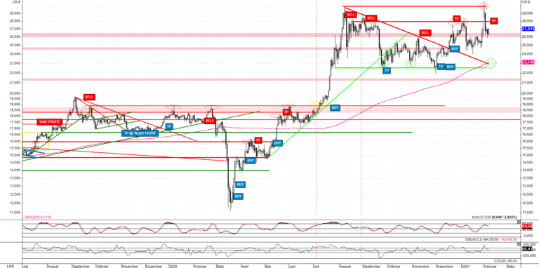 Der Wochenchart zeigt, dass der Silberpreis vermutlich eine Art Flaggenformation in einer Handelsspanne zwischen 22 US-Dollar auf der Unterseite und 28 US-Dollar auf der Oberseite ausbildet. Eine Konsolidierung innerhalb dieser Handelsspanne über weitere zwei bis drei Monate könnte genügend Kaufdruck aufbauen, damit der Preis anschließend dynamisch erst auf 36 US-Dollar und letztlich auf 48 US-Dollar ansteigen kann. Dieses Szenario ist für das Jahr 2021 durchaus denkbar.