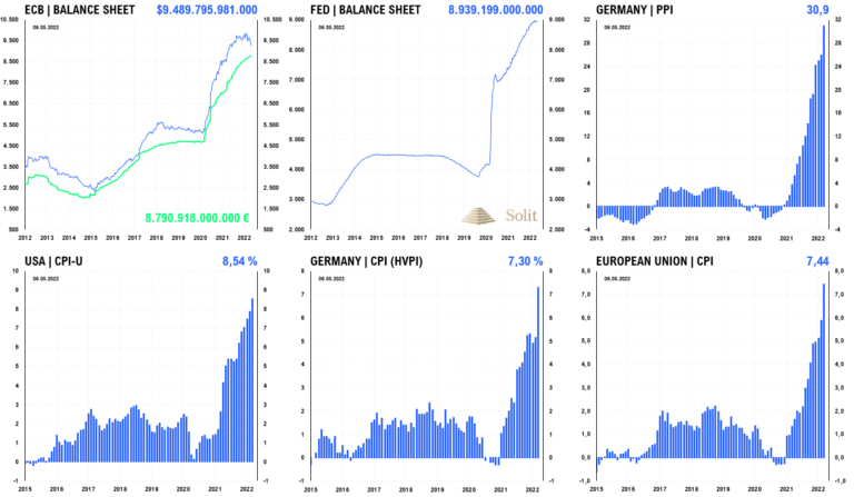 Fast alle Märkte schlossen die vergangene Handelswoche mit einem deutlichen Minus. Die Aktienmärkte, die Edelmetalle und auch die Kryptowährungen verbuchten teilweise dramatische Verluste. Noch am Mittwoch stiegen der Dow Jones und die Nasdaq stark an, nachdem das Ergebnis der letzten US-Notenbanksitzung nicht die schlimmsten Befürchtungen des Marktes erfüllte. Der US-Leitzins wurde dem Marktkonsens entsprechend um 50 Basispunkte angehoben, doch fiel die Reduzierung der US-Notenbankbilanz (Quantitative Tightening) mit 47,5 Mrd. anstatt 95 Mrd. US-Dollar pro Monat geringer aus. Die Verkäufe von Staatsanleihen sollen erst in den kommenden Monaten sukzessive von 30 Mrd. auf 60 Mrd. US-Dollar und die der hypothekenbesicherten Wertpapiere von 17,5 Mrd. auf 35 Mrd. US-Dollar auf insgesamt 95 Mrd. US-Dollar ausgeweitet werden.