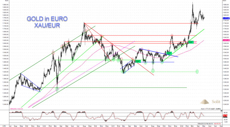 Auch wenn der Goldpreis zum verhältnismäßig starken US-Dollar aktuell in der Korrektur ist, was primär für Trader wichtig ist, zeigt sich für langfristige Investoren im Euroraum ein unverändert starker Goldpreis bei aktuell 1.776 (1776!) Euro je Feinunze. Die weitere Abwertung des Euros ist so sicher, wie das Amen in der Kirche, weshalb man nicht nur am sicheren Hafen des Goldes festhalten, sondern jeden Rücksetzer nutzen sollte, um weiter Vermögen in Fiat-Währungen in Gold umzuschichten. TINA (There Is No Alternative) gilt nun für die Edelmetalle, da weder der Anleihenmarkt, noch der Aktienmarkt bei dieser hohen Inflation und diesen stark steigenden Zinsen eine Option darstellen. Investieren Sie daher weiter in Gold, denn die nächsten Jahre der Stagflation wird man nur überstehen, wenn man sein Vermögen vor der Enteignung durch die Inflationssteuer und einem realen Einbruch der Aktienmärkte schützen kann!