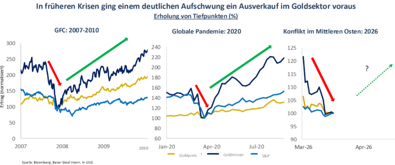 Eine vergleichende Grafik von Baker Steel zeigt, dass Goldminenunternehmen in früheren Krisenphasen wie der globalen Finanzkrise 2008 oder der Pandemie 2020 zunächst stark einbüßten, sich jedoch im Anschluss überdurchschnittlich erholten. Für den aktuellen Zyklus im Jahr 2026 bleibt die Entwicklung zwar noch offen, doch die strukturellen Parallelen sind laut Analyse auffällig.