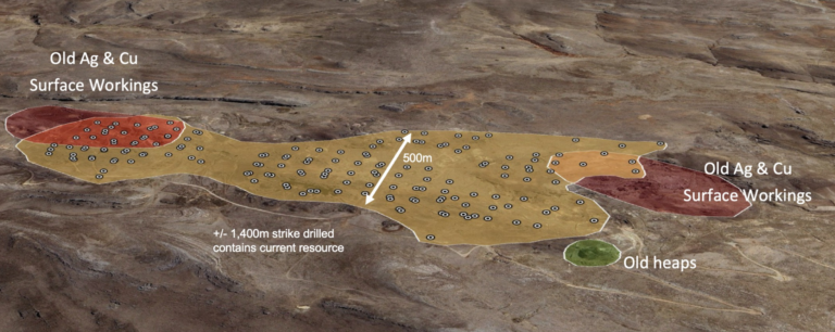 Die Ressource wurde zunächst auf einem Gebiet mit einer Streichlänge von ca. 1.400 Metern und einer Breite von rund 500 Metern ermittelt.