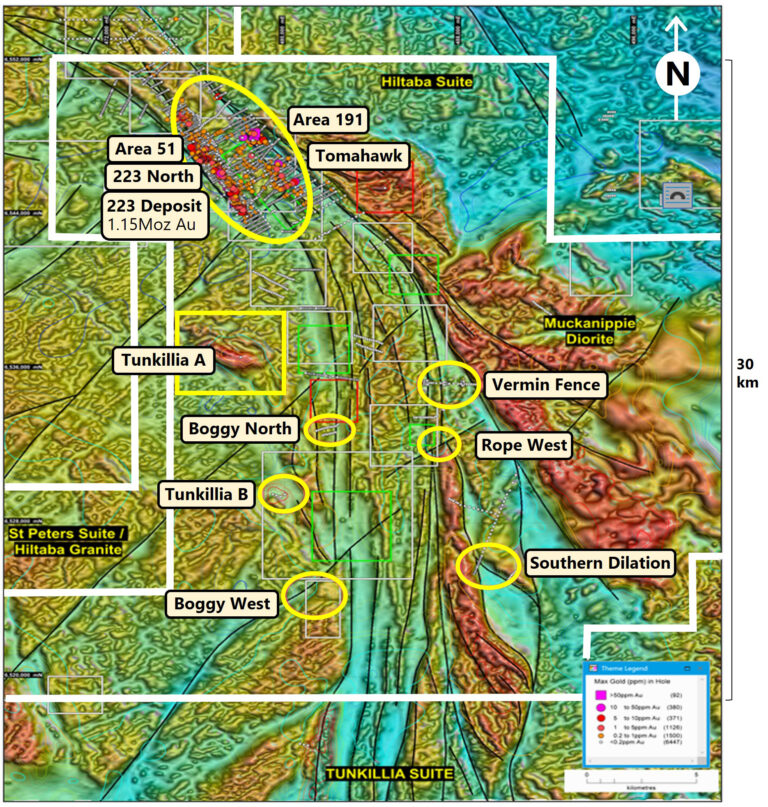 Tunkillia ist ein großes Explorationsprojekt mit einer Streichlänge von über 30 km. Prägend sind die Yerda und Yarlbrinda Scherzonen mit einer Breite von mehreren Kilometern, die Analogien zum großen Kalgoorlie Scherzonensystem aufweisen. Das Projekt ist außerhalb des Bereichs der Lagerstätte unterexploriert.
