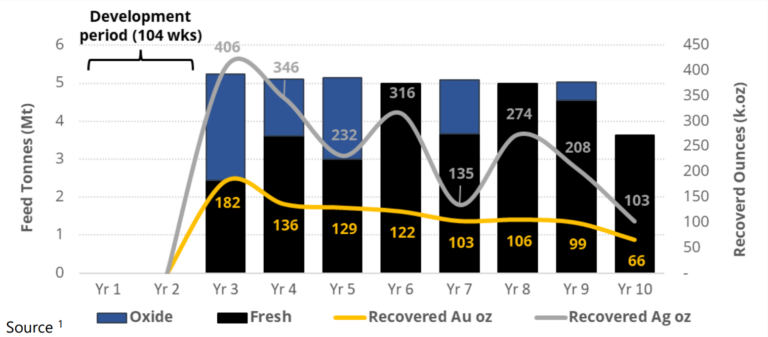 Abbildung 4 zeigt die jährliche Produktionsplanung von Gold und Silber im Tagebau gemäß der Planung in der aktuellen Scoping Studie zum Tunkillia Projekt: