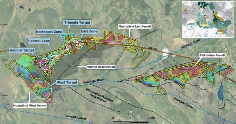 Abb. 3: Überblick über das Mustajärvi Projekt mit mehreren hochgradigen Goldmineralisierungszonen (Quelle: FireFox Gold)