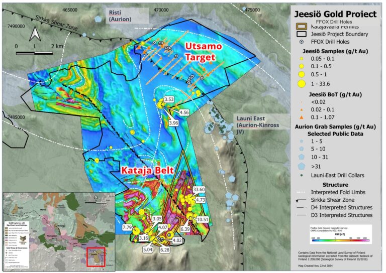 Seit 2017 bearbeitet FireFox das Projekt und hat aus Explorationsdaten und Bohrergebnissen momentan zwei Ziele im Projekt priorisiert. Dies sind Utsamo und der Kataja Gürtel. Utsamo liegt direkt zwischen den Goldentdeckungsgebieten Risti und Launi von Aurion. Der Kataja Gürtel befindet sich etwa zwei Kilometer südwestlich des goldhaltigen Quarz-Sulfid-Adersystems Launi. Folgende Abbildung zeigt das Jeesiö Projekt mit den beiden Zielgebieten: