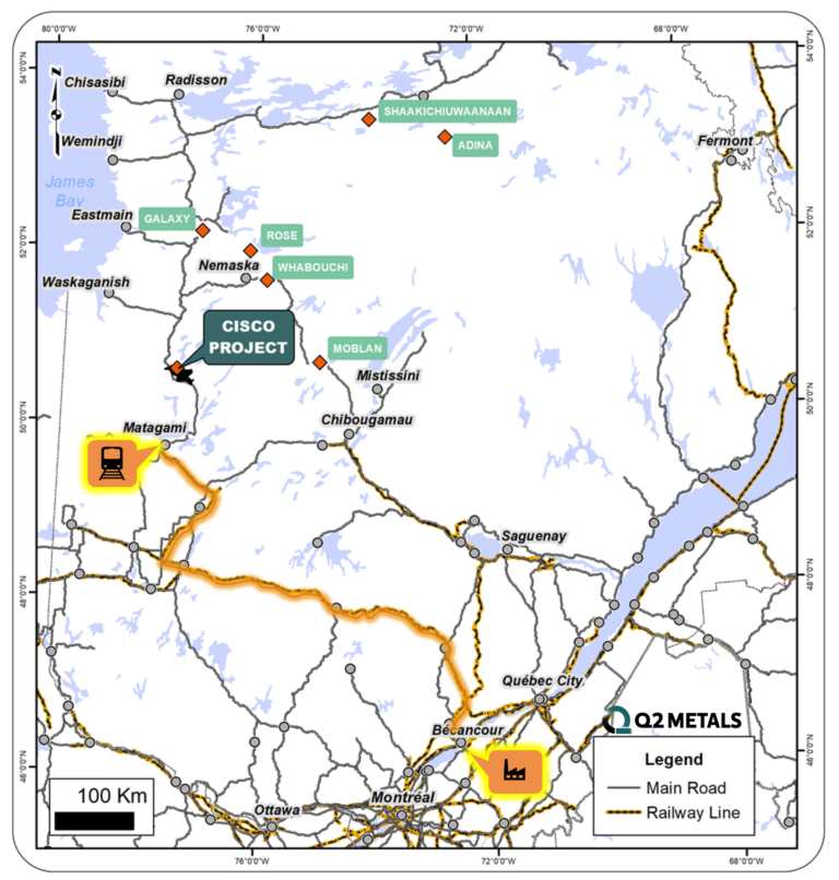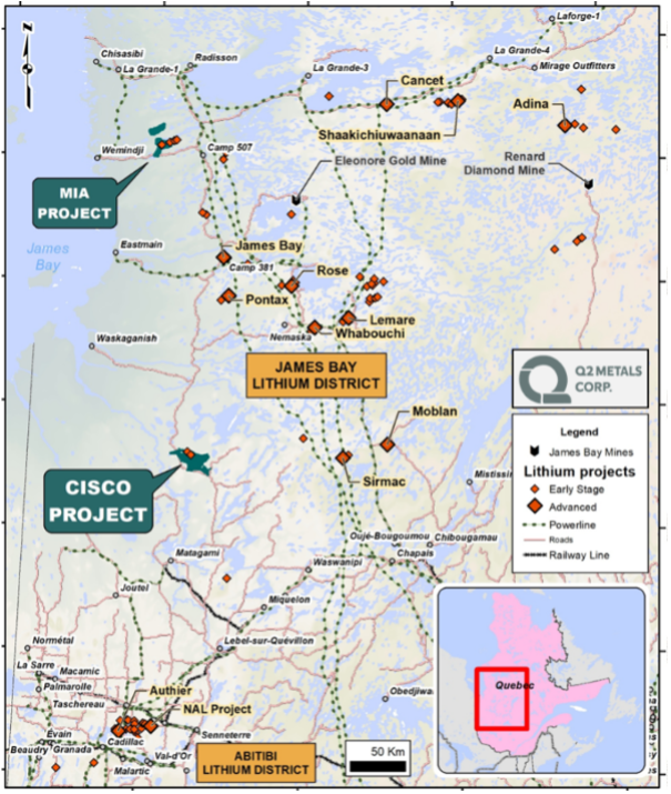 Mit dem Mia Projekt in Québec war Q2 Metals bereits auf die Lithiumexploration fokussiert. Im Februar 2024 übernahm man mit Cisco ein weiteres Lithiumprojekt im James Bay Lithium District entlang der Frotet Evans Grünsteingürtels. Die Region ist äußerst aussichtsreich und geprägt von einer Vielzahl von Lithiumlagerstätten und Projekten.