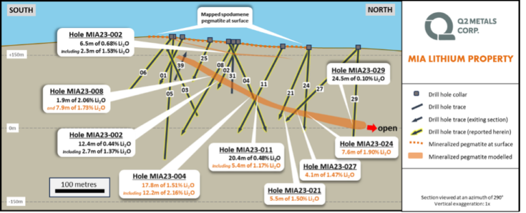 2023 nahm Q2 Metals im Projekt Bodenproben, was zu einer Definition von insgesamt 11 mineralisierten Zonen im Trend führte. Neben Lithium- wiesen die Proben auch Vorkommen an Tantaloxid aus. Highlights sind beispielsweise die MIA-8 Zone mit 9 Proben, die im Schnitt 2,07 % Li2O und 30 ppm Ta2O5 beinhalteten, die MIA-9 Zone mit 3 Proben von durchschnittlich 1,90 % Li2O und 66 ppm Ta2O5 oder die MIA-1 Zone mit 6 Proben mittelnd bei 1,8 % Li2O und 40 ppm Ta2O5.