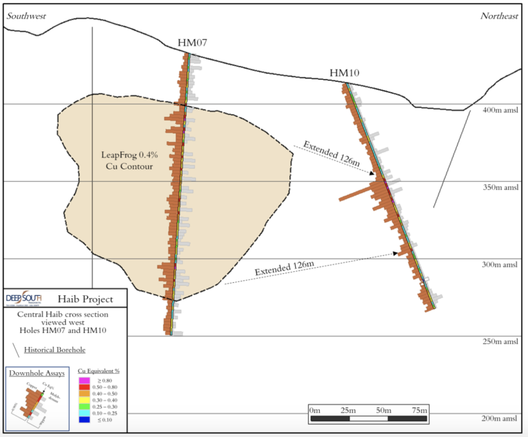 Das Loch HM06 war in der zentralen hochgradigen Zone von "Grube 2” gebohrt worden, um als Auffüllloch zu fungieren und um hochgradige Gehalte zu bestätigen, die zwischen recht weit auseinander liegenden Löchern extrapoliert worden waren. Loch HM10 sollte die hohen Grade in Richtung Nordosten prüfen. Beide Löcher trafen auf bedeutende Kupfer-Schnittpunkte, wobei HM07 das Vorliegen der hochgradigen Zone bestätigte. HM10 zeigt derweil, dass die Vererzung sich möglicherweise weiter nach Norden fortsetzt als zuvor