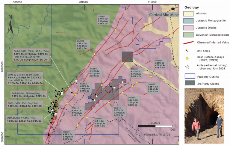 Carrizal umfasst die beiden Teilgebiete Farellon und Perth. In Farellon fanden bereits historische Explorationen mit Bohrungen statt. Unabhängige Bewertungen schätzten ein Potenzial von sieben Millionen Tonnen in der zentralen mineralisierten Zone. Nach der Übernahme erweiterte Red Metal das Projekt durch zusätzliche Claims. 2022 folgte ein Bohrprogramm, das die Kupfer-Gold-Kobalt-Mineralisierung bestätigte. 2025 startete ein umfassendes Mapping- und Probenprogramm, um historische und neu identifizierte Strukturen weiter zu verfolgen und zusätzliche Bohrziele zu definieren.