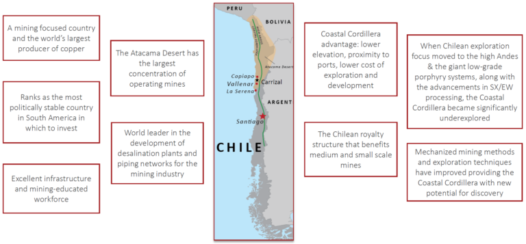 Chile gilt als politisch sehr stabil mit exzellenter Infrastruktur und gut ausgebildeten Arbeitskräften im Bergbau. Der Bergbausektor kleinerer Betriebe ist gut entwickelt und reguliert. Minen bis zu 20 Kilotonnen pro Monat können schnell genehmigt werden. Etwa 25 Prozent der weltweiten Kupferproduktion stammen aus kleineren Minen mit weniger als 50 Kilotonnen pro Jahr. Diese Minen sind in Chile günstiger besteuert, was die Wirtschaftlichkeit kleinerer Projekte begünstigt.