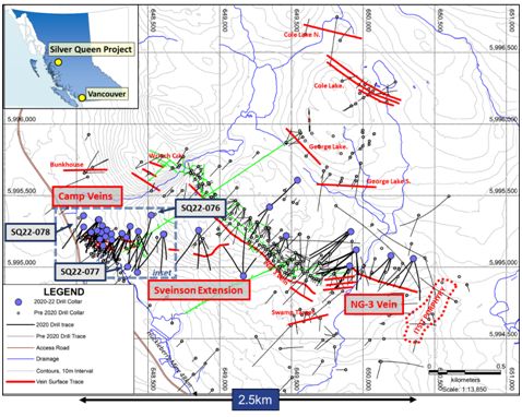 Auch die Bohrungen beim Ziel "Sveinson" unweit des Übergangs zum Ziel "Camp", die dessen gesamte 200 Meter messende Breite erprobten, durchteuften mehrere Adern. Bemerkenswert ist ein Abschnitt aus Bohrloch SQ22-076 von 0,4 Metern mit einem Gehalt von 653 Gramm Silber, 1,3 Gramm Gold 7,3 Prozent Kupfer, 0,1 Prozent Blei und 0,4 Prozent Zink (entspricht 19,5 Gramm Gold-Äquivalent oder 1.462 Gramm Silber-Äquivalent) innerhalb eines 1,6-Meter-Abschnitts mit 232 Gramm Silber, 0,8 Gramm Gold, 3,3 Prozent Kupfer, 0,1 Prozent Blei und 0,4 Prozent Zink (das sind 8,7 Gramm Gold-Äquivalent oder 649 Gramm Silber-Äquivalent.) Auch hier beziehen sich Gramm- und Prozentwerte wieder jeweils auf eine Tonne.
