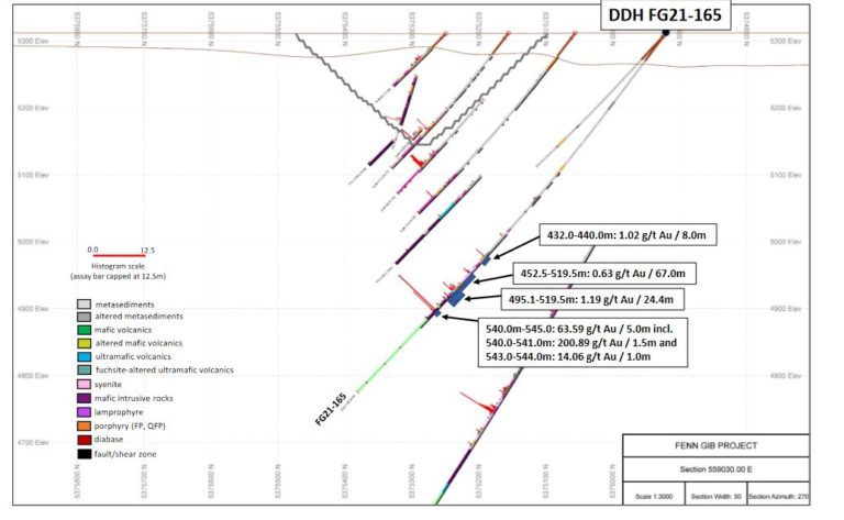 Bohrloch FG21-165 schließlich ergab einen außergewöhnlich hochgradigen Abschnitt von 5 Metern zu 63,59 Gramm Gold pro Tonne, inklusive 1,5 Metern mit 200,89 Gramm pro Tonne. Dieser Abschnitt befindet in einer Bohrtiefe von 540 Metern (das entspricht etwa 400 Vertikalmetern ab Oberfläche), ebenfalls unterhalb des erwähnten flachen, zentralen Abschnitts