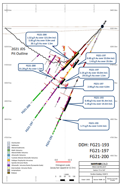 FG21-187 erbrachte bei seiner Auswertung 22,9 Meter mit 2,82 Gramm Gold. FG21-197 ergab 53,0 Meter zu 0,85 Gramm Gold sowie 33,0 Meter mit 2,25 Gramm Gold.