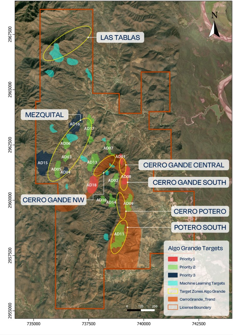 Die bisherigen Bohrarbeiten in der Cerro-Grande-Zone wurden 2025 gestartet, rund 1.000 Meter wurden bereits niedergebracht. Weitere Bohrungen sind für Januar und Februar 2026 geplant. Besonders die Ziele AD01, AD08 und AD18 gelten als bohrbereit, da sie starke Anomalien in mehreren Datensätzen zeigen.