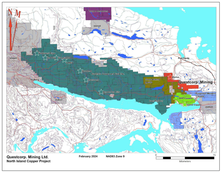 Neben dem hochgradigen Gold-Silber-Projekt in Mexiko besitzt Questcorp mit dem North Island Copper Property in British Columbia eine zweite strategisch interessante Liegenschaft. Das Projekt liegt in unmittelbarer Nähe zur früheren BHP Island Copper Mine und weist Anzeichen für Kupfer-Silber-Skarn- und Porphyrvererzung auf. Erste historische Bohrungen zeigen steigende Kupfergehalte in der Tiefe. Eine moderne geophysikalische Untersuchung ist geplant, um gezielte Bohrziele zu definieren.