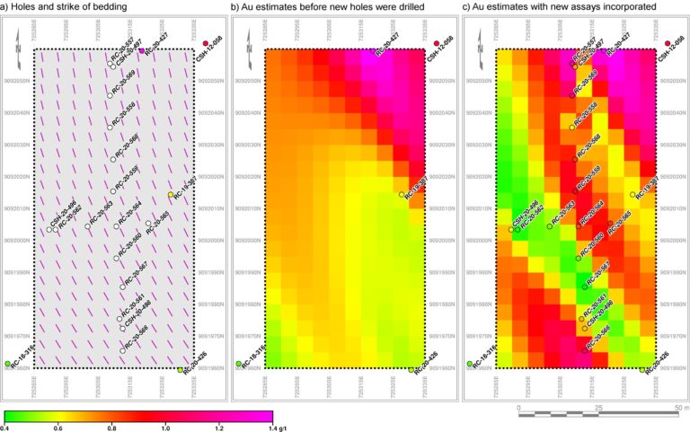 Das beauftragte Labor hat bereits einige Ergebnisse der Proben aus sechzehn Bohrlöchern gemeldet. Mit einer Abbildung illustriert TriStar die Resultate: Farbige Kreise markieren den durchschnittlichen Ressourcengehalt von 0,3 Gramm Gold pro Tonne in den oberen 24 Metern der Bohrlöcher, die beiden nebenstehenden Darstellungen beschreiben die Prognose der Gehalte jeweils vor und nach Einrechnung der neuen Probenanalysen. All das basiert auf einem litho-geochemischen Modell.